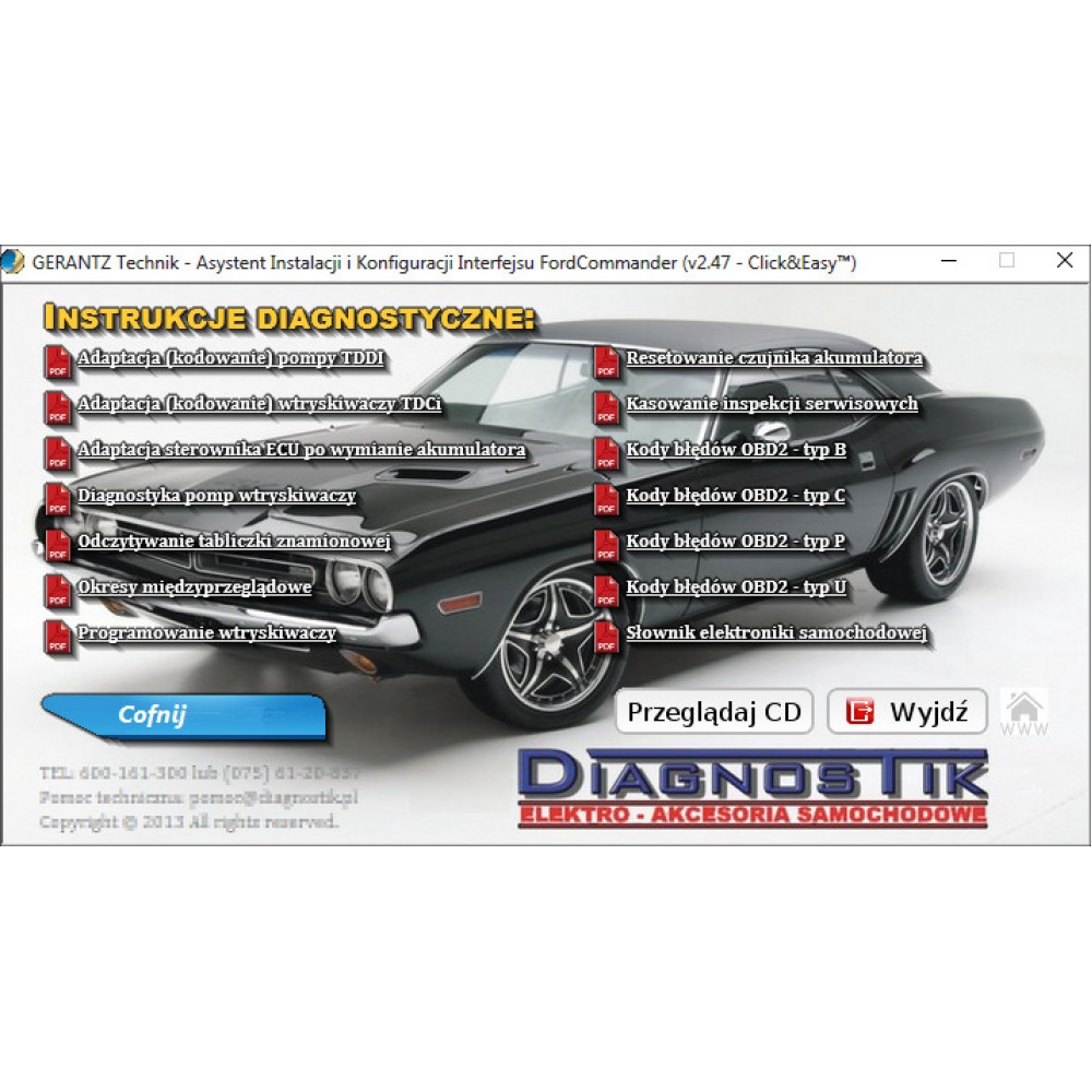 (instrukcje, lokalizacje złącz diagnostycznych w poszczególnych autach, porady diagnostyczne, w tym: kasowanie kontrolek inspekcji serwisowych i olejowych, kody błędów.) oraz nasz autorski program: Asystent Instalacji i Konfiguracji Urządzenia w wersji 2.47, z TECHNOLOGIĄ Click&Easy™