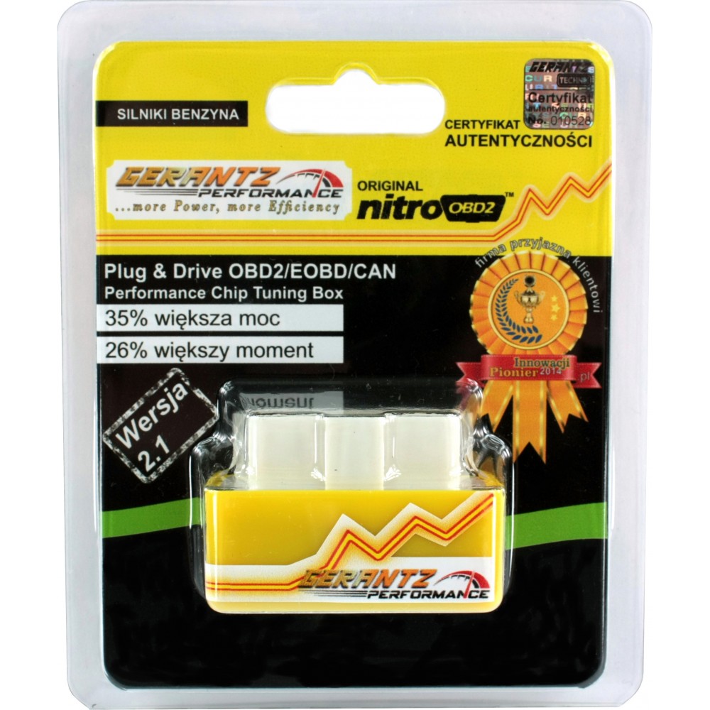 Jest to Chip, który jest podłączany do gniazda OBD2 w celu zwiększenia wydajności pracy silnika pojazdu oraz podniesienia jego parametrów (moc oraz moment obrotowy). Urządzenie to nie przekracza wymagań producenta oraz działa tylko w granicach tolerancji danego silnika. Jest prosty w użyciu i pozwala na całkowicie bezpieczną formę tuningu. Chip Nitro OBD2 to produkt wysokiej jakości, drukowany w technice SMD.