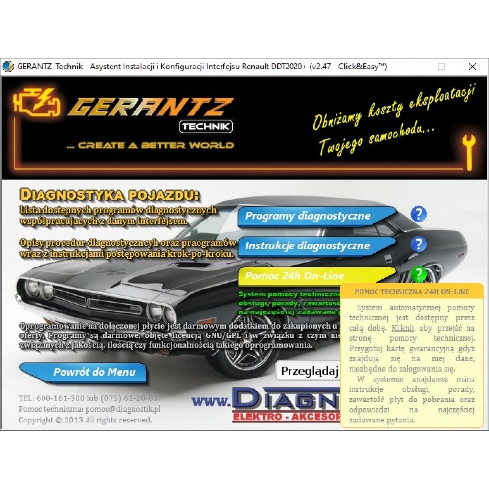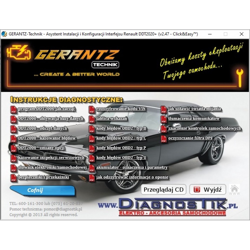 (instrukcje, lokalizacje złącz diagnostycznych w poszczególnych autach, porady diagnostyczne, w tym: kasowanie kontrolek inspekcji serwisowych i olejowych, kody błędów.) oraz nasz autorski program: Asystent Instalacji i Konfiguracji Urządzenia w wersji 2.47, z TECHNOLOGIĄ Click&Easy™